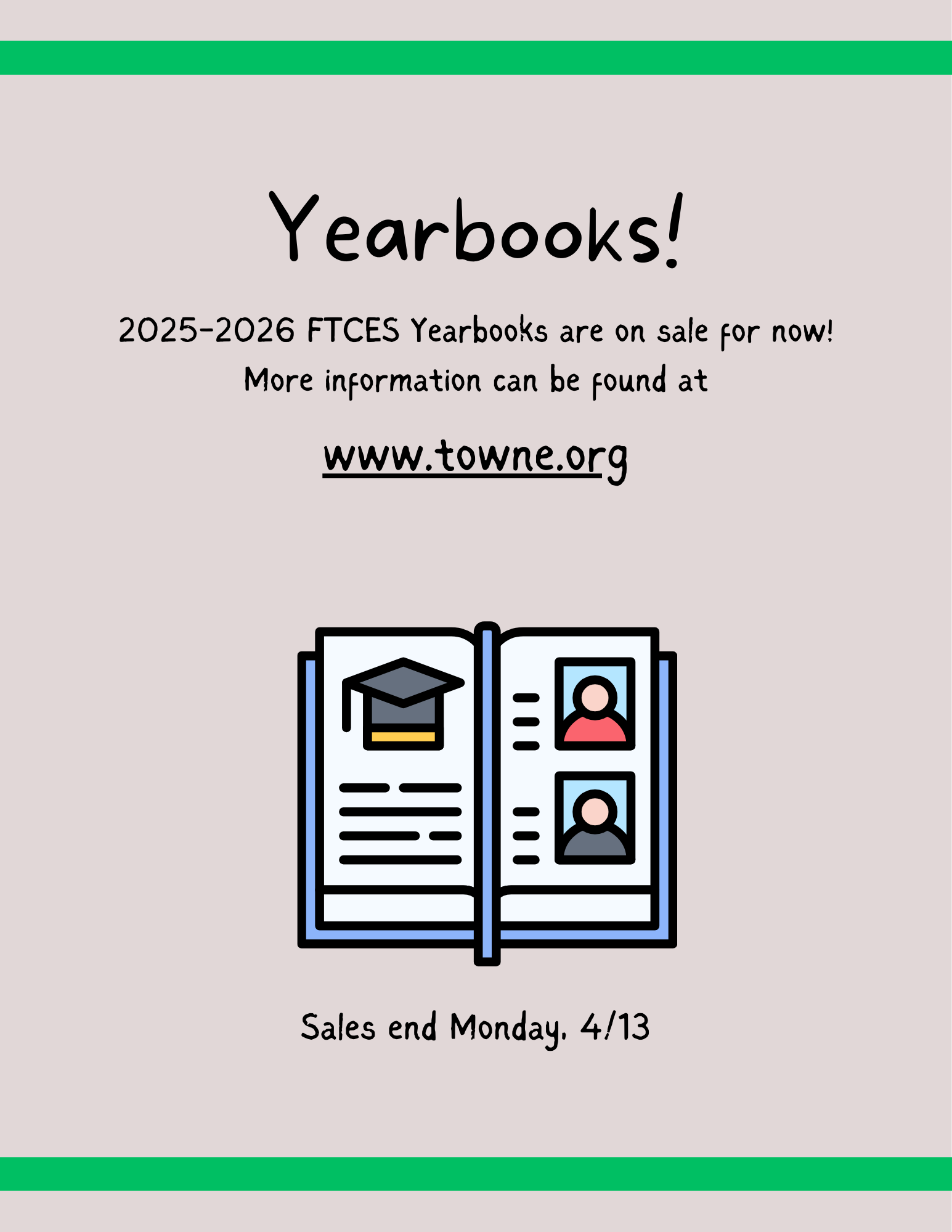 We are excited to announce that the 2025-2026 FTCES Yearbook is now available for purchase! All yearbook purchases must be made online at www.ybpay.com. FTCES cannot accept cash or check payments. Please use the FTCES Yearbook ID: 15315826 to ensure your order is processed successfully.